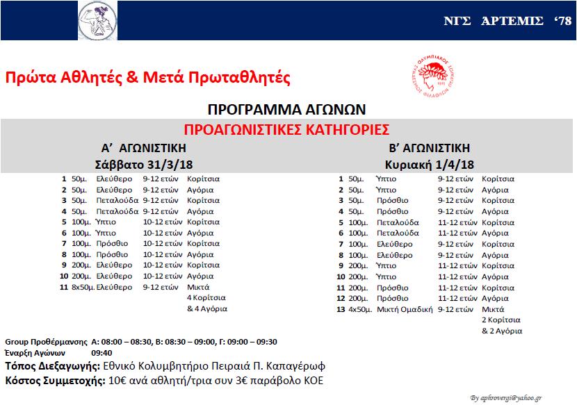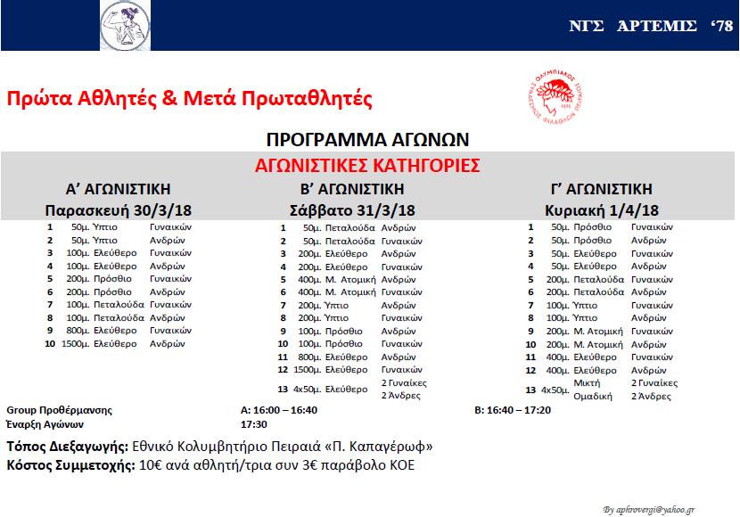 Η ΝΓΣ Άρτεμις '78 με 50 αθλητές και αθλήτριες δίνει το παρόν στους αγώνες (30/3-1/4) που διοργανώνει ο Ολυμπιακός. Το Δ.Σ της ομάδος μας εύχεται σε όλους τους αθλητές καλή επιτυχία !!!