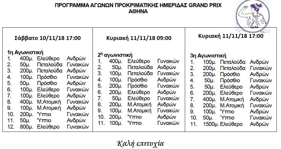 Ημερίδα Ορίων G.P. Αθήνα Tweet Share TwitterΈναρξη κολυμβητικής περιόδου για το αγωνιστικό μας τμήμα!Καλή επιτυχία στους αθλητές και τις αθλήτριες μας!