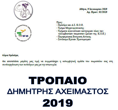Θα αποτελέσει μεγάλη μας τιμή να συμμετάσχει η κολυμβητική ομάδα του σωματείου σας στην συνδιοργάνωση των συλλόγων μας με την επωνυμία :